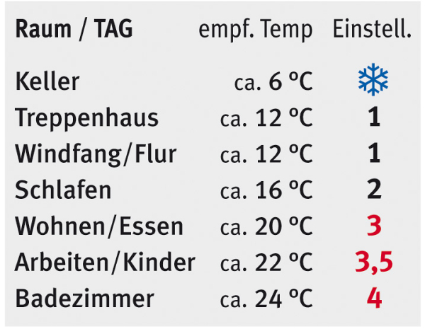 Empfohlene Richtwerte und Thermostateinstellungen,